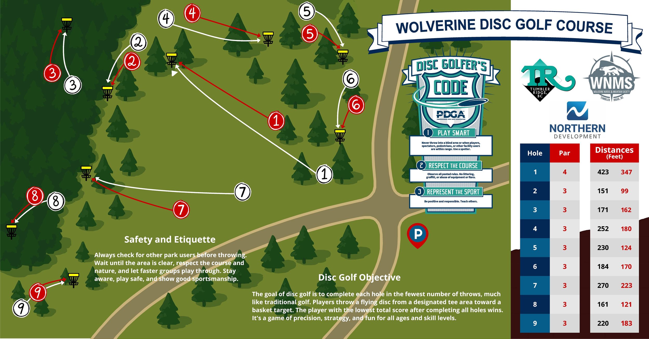 Tumbler Ridge continues to expand its outdoor recreation offerings with the addition of a permanent disc golf course, established by the Wolverine Nordic and Mountain Society in partnership with the District of Tumbler Ridge and with support from the Northern Development Initiative Trust. Integrated into Tumbler Ridge’s expanding outdoor recreation network, the Wolverine Disc Golf Course offers a welcoming, accessible experience for visitors and residents alike.